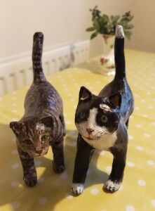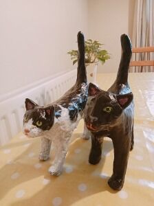 I enjoy making paper mache objects. The materials are easy to find around the house. You just need newspapers and glue to build the shape. When I am making paper mache, it is easy to forget time.These two cats are called " Happy Tails". ...more